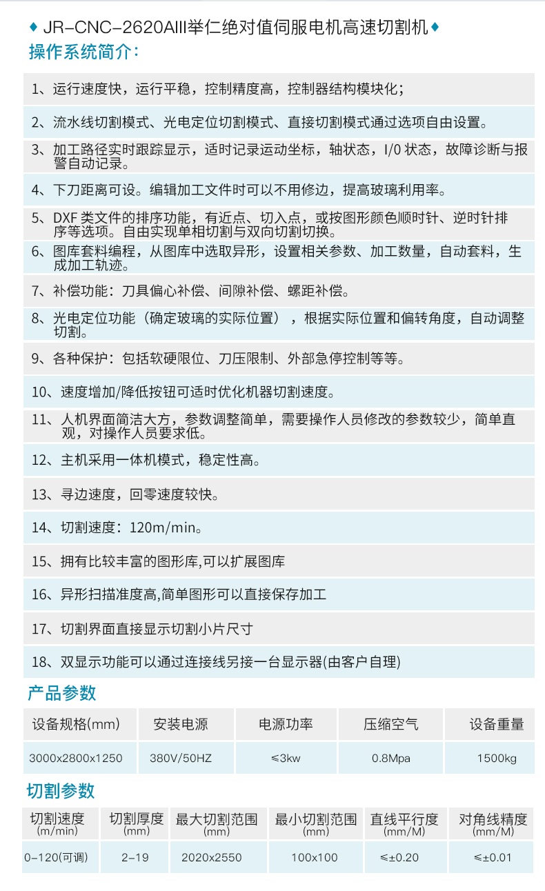 操作系統簡介:l 、運行速度快,運行平穩,控制精度高,控制器結構模塊化; 2 、流水線切割模式、光電定位切割模式、直接切割模式通過選項自由設置。 3 、加工路徑實時跟蹤顯示,警自動記錄。適時記錄運動坐標,軸狀態, ! / 0 狀態,故障診斷與報 4 、下刀距離可設。編輯加工文件時可以不用修邊,提高玻璃利用率。 5 、 OX 「類文件的排序功能,有近點、切入點,或按圖形顏色順時針、逆時針排序等選項。自由實現單相切割與雙向切割切換。 6 、圖庫套料編程,從圖庫中選取異形,設置相關參數、加工數量,自動套料,生成加工軌跡。了、補償功能:刀具偏心補償、間隙補償、螺距補償。 8 、光電定位功能(確定玻璃的實際位置)切割。根據實際位置和偏轉角度,自動調整 9 、各種保護:包括軟硬限位、刀壓限制、外部急停控制等等。、速度增加/降低按鈕可適時優化機器切割速度。、人機界面簡潔大方,參數調整簡單,需要操作人員修改的參數較少,簡單直觀,對操作人員要求低。、主機采用一體機模式,穩定性高
