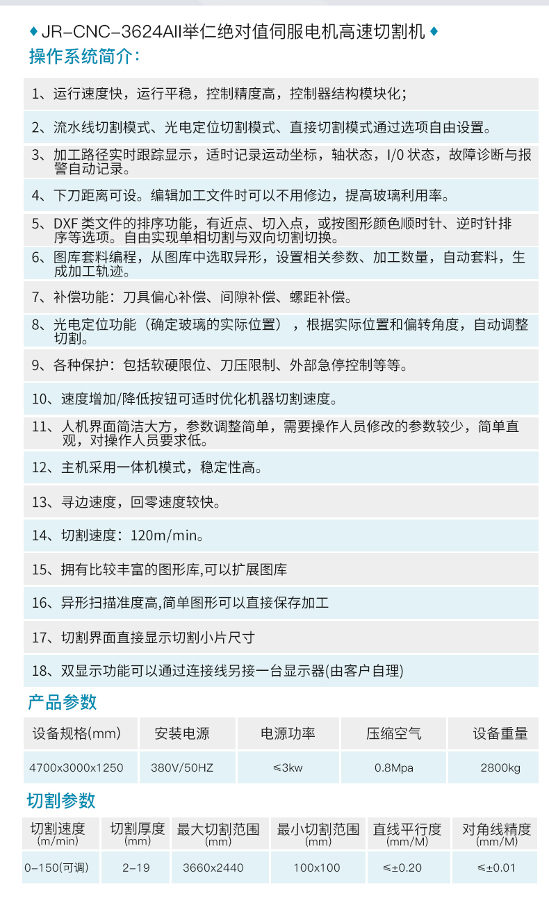 操作系統(tǒng)簡(jiǎn)介:l 、運(yùn)行速度快,運(yùn)行平穩(wěn),控制精度高,控制器結(jié)構(gòu)模塊化; 2 、流水線切割模式、光電定位切割模式、直接切割模式通過(guò)選項(xiàng)自由設(shè)置。 3 、加工路徑實(shí)時(shí)跟蹤顯示,警自動(dòng)記錄。適時(shí)記錄運(yùn)動(dòng)坐標(biāo),軸狀態(tài), ! / 0 狀態(tài),故障診斷與報(bào) 4 、下刀距離可設(shè)。編輯加工文件時(shí)可以不用修邊,提高玻璃利用率。 5 、 OX 「類(lèi)文件的排序功能,有近點(diǎn)、切入點(diǎn),或按圖形顏色順時(shí)針、逆時(shí)針排序等選項(xiàng)。自由實(shí)現(xiàn)單相切割與雙向切割切換。 6 、圖庫(kù)套料編程,從圖庫(kù)中選取異形,設(shè)置相關(guān)參數(shù)、加工數(shù)量,自動(dòng)套料,生成加工軌跡。了、補(bǔ)償功能:刀具偏心補(bǔ)償、間隙補(bǔ)償、螺距補(bǔ)償。 8 、光電定位功能(確定玻璃的實(shí)際位置)切割。根據(jù)實(shí)際位置和偏轉(zhuǎn)角度,自動(dòng)調(diào)整 9 、各種保護(hù):包括軟硬限位、刀壓限制、外部急停控制等等。、速度增加/降低按鈕可適時(shí)優(yōu)化機(jī)器切割速度。、人機(jī)界面簡(jiǎn)潔大方,參數(shù)調(diào)整簡(jiǎn)單,需要操作人員修改的參數(shù)較少,簡(jiǎn)單直觀,對(duì)操作人員要求低。、主機(jī)采用一體機(jī)模式,穩(wěn)定性高